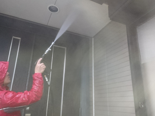 足場組立後、高圧洗浄機で埃・苔などを