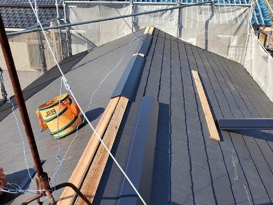 棟芯木・棟板金の設置 棟部分の棟包・棟板金の設置