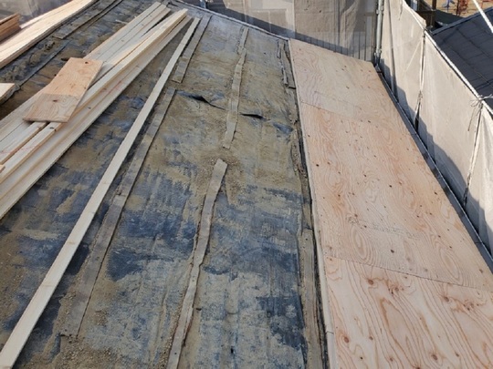既存瓦の撤去 浅木の撤去後 野地板の設置